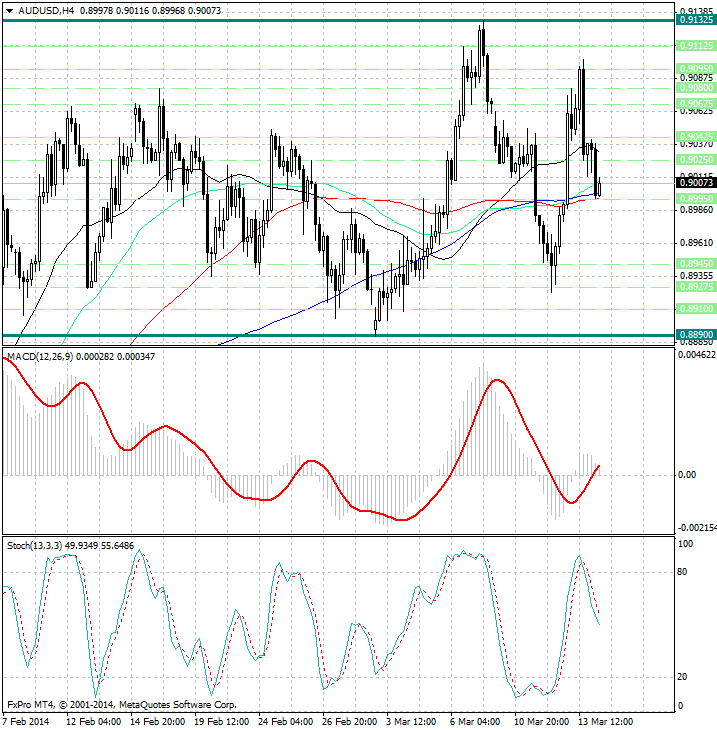 Курс валюты зажат между скользящей средней с периодом 34 (уровень сопротивления 0.9030) с одной стороны и средних с периодами 144 и 89 (уровень поддержки 0.9000/0.8995) с другой, и в данный момент практически слился со средней с периодом 55.
