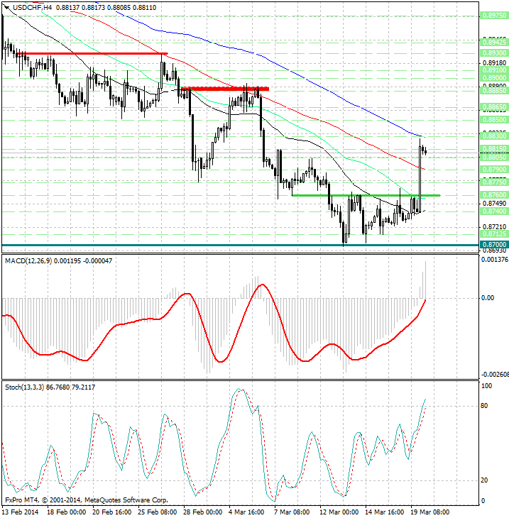 Обратив внимание на 4х часовой график можно заметить, что на торгах в среду консолидация в рамках ценового диапазона 0.8760 - 0.8700 (область 3х летних min) завершилась пробоем его верхней границы и наша первая цель 0.8815 была достигнута в конце американской сессии...