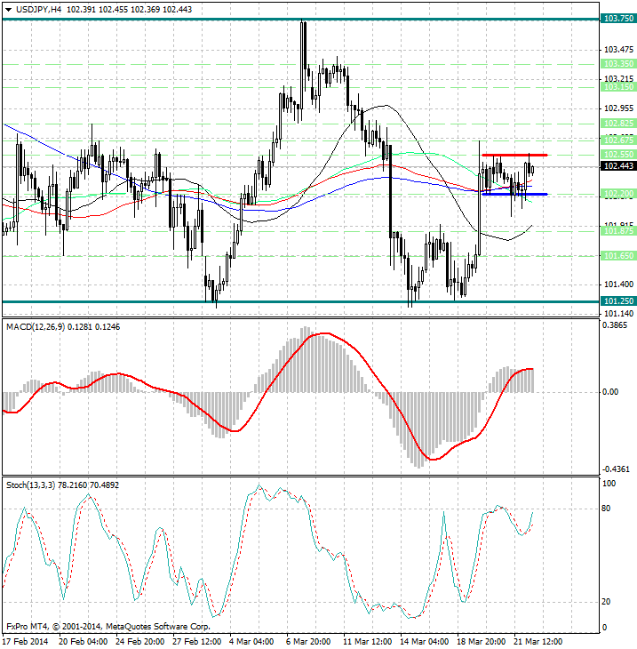 В минувшую пятницу по японской йене не проявлялись настроения инвесторов по причине выходного дня в Японии. Сегодня опубликованный индекс деловой активности в производственном секторе Китая от HSBC за март показал снижение с 48,5 до 48,1 против ожидания ещё большего роста к 48,7. К 7:00 мск японский индекс Nikkei225 прибавляет 1,83%, китайский Shanghai Composite 0,12% (после роста в моменте на 0,68%), но данный рост, потянувший за собой и йену, более связан с трёхдневными выходными, нежели с экономическим или политическим позитивом. Через неделю налог на продажи повысится до 8% и в ближайшее время ожидаем разворот японской валюты. Банк Японии не делал каких-либо заявлений о превентивных действиях, всё же он должен проанализировать воздействие повышения налога на экономику. Пока ожидаем торговлю в диапазоне 102.40-102.90.