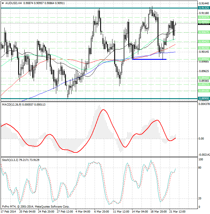 Курс валюты вновь закрепился выше скользящих средних с периодами 34, 55, 89 и 144, которые теперь являются рядом уровней поддержки 0.90725, 0.9050, 0.9035 и 0.9015.