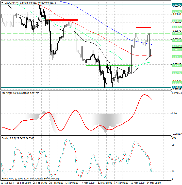 1. Пробой уровня сопротивления 0.8820 и рост USD/CHF к уровням 0.88675 и 0.8930 (локальный max).