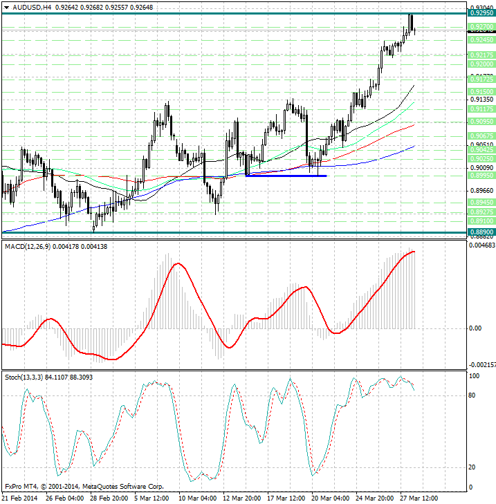 Начнем с того, что наш вчерашний форекс прогноз подтвердился - пробой уровня сопротивления 0.9245 привел к очередному усилению бычьих настроений и наша первая цель 0.9300 была практически достигнута сегодня на торгах в Азии. Уже возле уровня 0.9295 (область 4х месячных max) бычьи настроения утихли, после чего началась коррекция, которая продолжается до сих пор...