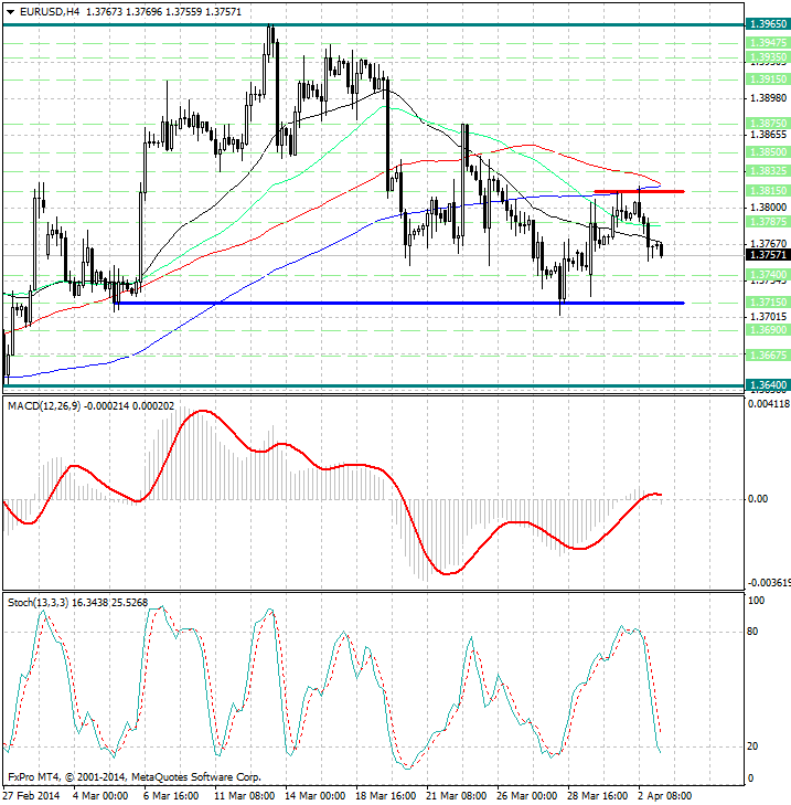 Единая валюта плавно откатывается вверх после провала, который имел место с 25 по 27 марта. Котировка пары евро/доллар второй день торгуется в пределах уровня сопротивления 1.3800. Трейдерам следует аккуратно присматриваться к продажам.