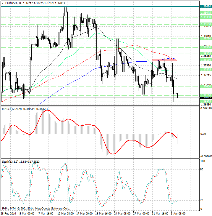 ЕЦБ оставил ставку прежней, однако после этого сделал все, чтобы убедить инвесторов, что текущий уровень единой валюты неприемлем. Были в комментариях Марио Драги и оптимистичные моменты: он уверил рынки в том, что в апреле инфляция начнет рост, а мартовская слабость была связана с празднованием Пасхи. Тем не менее, большую часть конференции он все же посвятил разговорам о вероятности дополнительного стимулирования, а также подробному описанию вариантов дополнительного стимулирования. Особенно детально он разговаривал на тему количественного смягчения, еще одного снижения ставки, отрицательных уровней ставки по депозитам, а также сужению коридора ставок. И впервые за долгое время Драги упомянул об одном из серьезнейших рисков для экономики – о стагнации. Все эти разговоры о возможностях стимулирования на фоне продолжающегося сворачивания ФРС способны ограничить рост евро в среднесрочной перспективе. И сегодня мы вновь ждем падения пары в случае сильных данных по нон-фармам. Несмотря на довольно сильную поддержку в районе 1,37, пробой вполне реален и следующей остановкой станет 1,3650.