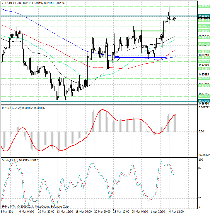 Обратив внимание на 4х часовой график можно заметить, что:курс валюты встретил существенное сопротивление возле уровня 0.8925 (область 2х месячных max),со второй половины дня прошлой пятницы сохраняется ощутимое давление на USD/CHF...