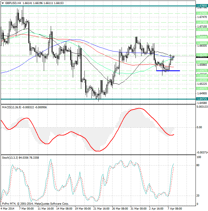 Курс валюты закрепился выше скользящих средних с периодами 55, 144 и 89, которые теперь являются уровнями поддержки 1.6610 и 1.6580, и в данный момент слился со средней с периодом 34.