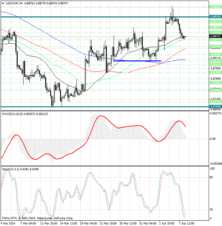 Курс валюты по-прежнему расположен выше скользящих средних с периодами 55, 89 и 144, которые направлены вверх и указывают на сохраняющиеся бычьи настроения (в среднесрочной перспективе), а также являются рядом уровней поддержки 0.8870, 0.8845 и 0.88175, и в данный момент слился со средней с периодом 34.
