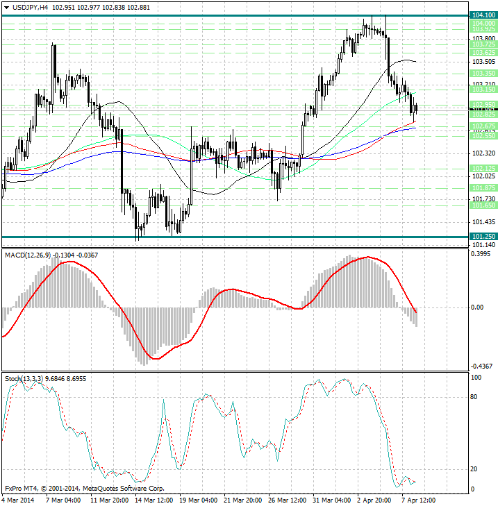 Курс валюты зажат между скользящих средних с периодами 55 и 34 (уровни сопротивления 103.10 и 103.50) с одной стороны и средних с периодами 89 и 144 (уровни поддержки 102.75 и 102.65) с другой.
