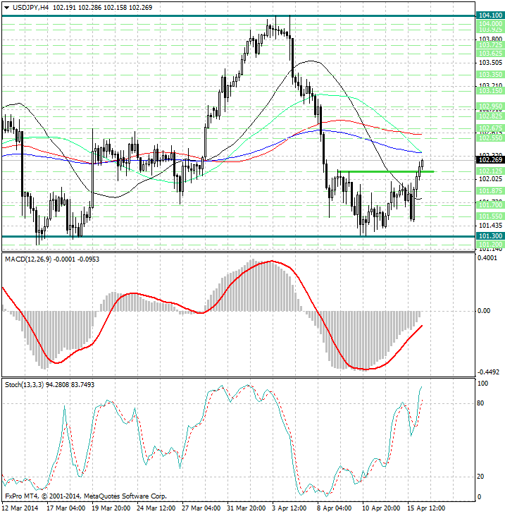 Курс валюты зажат между скользящих средних с периодами 144, 55 и 89 (уровни сопротивления 102.35 и 102.60) с одной стороны и средней с периодом 34 (уровень поддержки 101.80) с другой.