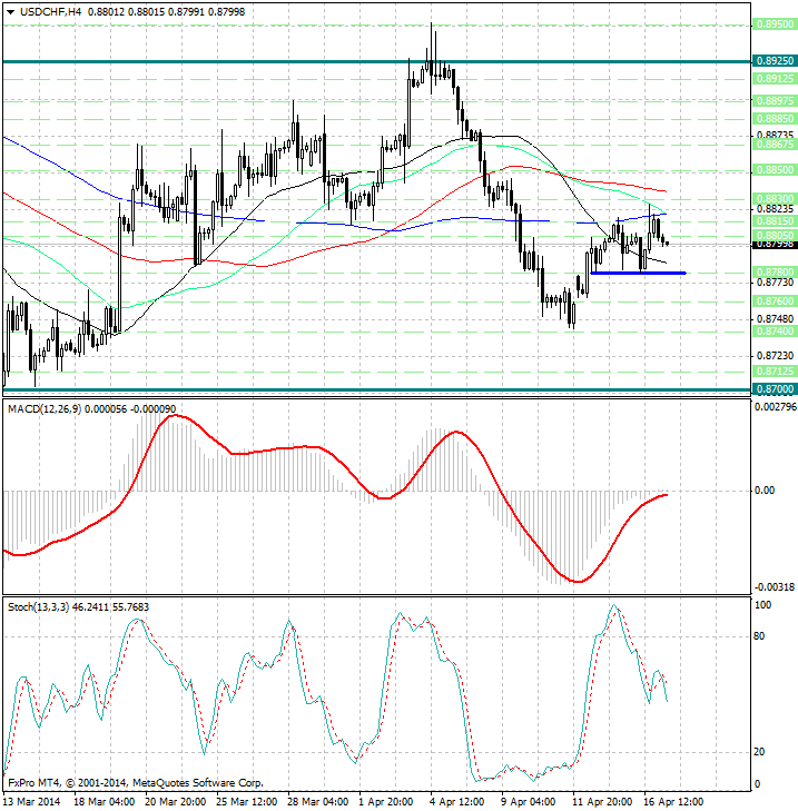 Курс валюты зажат между скользящих средних с периодами 144, 55 и 89 (уровни сопротивления 0.8820 и 0.8835) с одной стороны и средней с периодом 34 (уровень поддержки 0.87875) с другой.