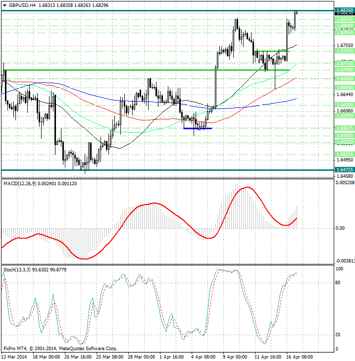 Обратив внимание на 4х часовой график можно заметить, что на торгах в среду пробой уровня сопротивления 1.67425 привел к значительному усилению бычьих настроений и наша первая цель 1.6820 была достигнута в ходе европейской сессии. Также отметим, что уже сегодня на торгах в Азии курс валюты вплотную приближался к нашей второй цели - 1.6850. С точки зрения фундаментального анализа, британский фунт получил значительную поддержку после публикации позитивных данных с рынка труда Великобритании:число заявлений на получение пособий по безработице продолжает существенно сокращаться,уровень безработицы неожиданно снизился до рекордно низкого уровня...