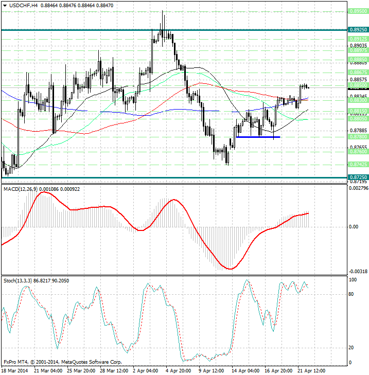 Курс валюты расположен выше скользящих средних с периодами 144, 89, 34 и 55, которые являются рядом уровней поддержки 0.88325/30, 0.88175 и 0.8805.