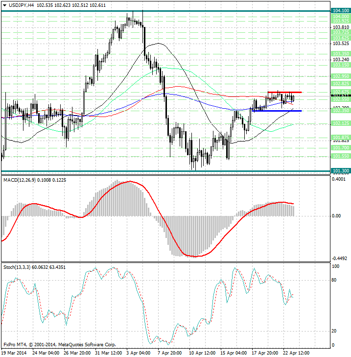 Обратив внимание на 4х часовой график можно заметить, что уже длительный период времени торги не выходят за рамки ценового диапазона 102.675 - 102.35. Это в свою очередь сигнал о том, что на рынке форекс в данной валютной паре сохраняется краткосрочная неопределенность...