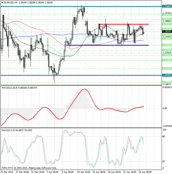 Важных новостей на понедельник не запланировано. В преддверии выхода предварительных данных по индексу потребительских цен в Германии (29 апреля) участникам рынка будут интересны выступления представителей ЕЦБ в понедельник: Констанцио, Керре и Прата. Точное время выступлений неизвестно. Если все представители в один голос заявят о наносящем вред экономике еврозоны высоком курсе евро, то перед заседанием ФРС США евро/доллар не удержится на уровне 1,38. Пара может снизиться до 1,37.