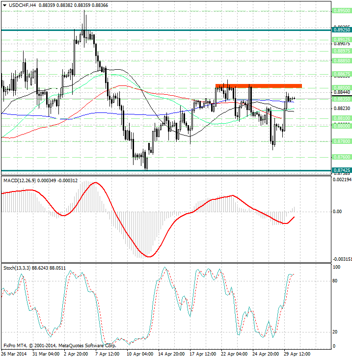 Курс валюты закрепился выше скользящих средних с периодами 144, 55, 34 и 89, которые теперь являются рядом уровней поддержки 0.88325, 0.8825/20 и 0.8810.