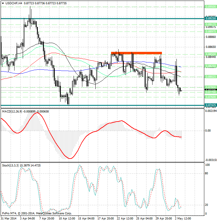 Доллар на данных по рынку труда поднялся до 0,8840 и в сегодня в Азии уже торгуется по 0,8775. Доллар растерял все очки и копаться в отчете уже не стоит. Он будет важен только в следующем июне, а сейчас все внимание участников рынка направлено на заседание ЕЦБ, которое состоится 8 мая. После резкого падения курса до 0,8765 от USDCHF ожидаю восстановление до 0,88. Понедельник для меня коррекционный день, поэтому рассматриваю движение против пятницы.