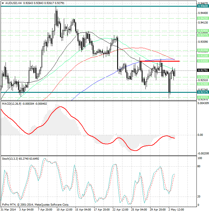 Курс валюты зажат между скользящих средних с периодами 89 и 144 (уровень сопротивления 0.9310) с одной стороны и средней с периодом 34 (уровень поддержки 0.9270) с другой, и в данный момент практически слился со средней с периодом 55.