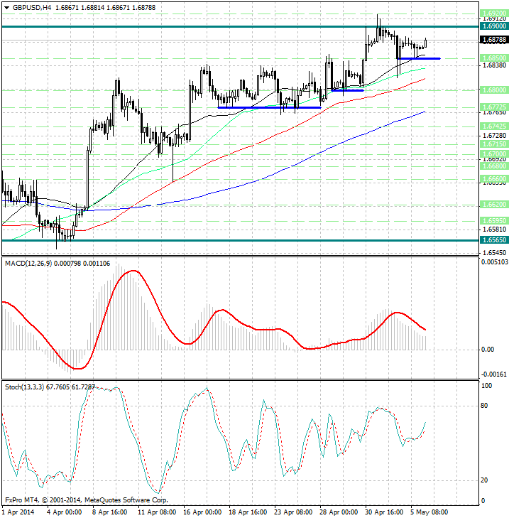 Обратив внимание на 4х часовой график можно заметить, что:курс валюты вновь нашел ощутимую поддержку возле уровня 1.6850,третий час в данной валютной паре доминируют бычьи настроения...