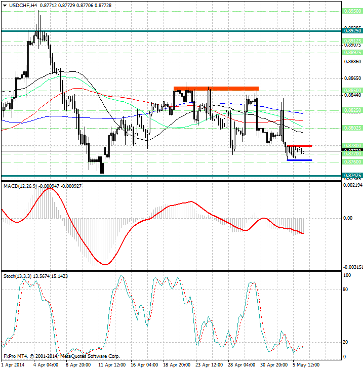 Курс валюты по-прежнему расположен ниже скользящих средних с периодами 34, 55, 89 и 144, которые являются рядом уровней сопротивления 0.87975, 0.8805, 0.8810 и 0.8820.