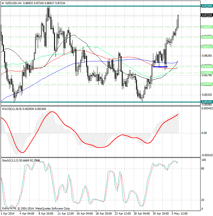 Поэтому, мы ожидаем, что рост новозеландского доллара (NZD) продолжится и может усилиться, если будет пробит локальный max 0.8745, который может открыть путь к уровням 0.8800 и 0.8840.