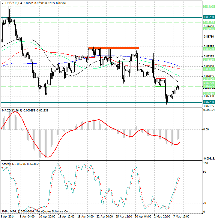 Курс валюты по-прежнему расположен ниже скользящих средних с периодами 34, 55, 89 и 144, которые направлены вниз и указывают на сохраняющиеся медвежьи настроения (в среднесрочной перспективе), а также являются рядом уровней сопротивления 0.87725, 0.87875, 0.8805 и 0.8810.