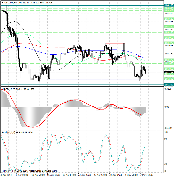 Курс валюты по-прежнему расположен ниже скользящих средних с периодами 34, 55, 144 и 89, которые направлены вниз и указывают на сохраняющиеся медвежьи настроения, а также являются рядом уровней сопротивления 102.025, 102.15, 102.225 и 102.275.