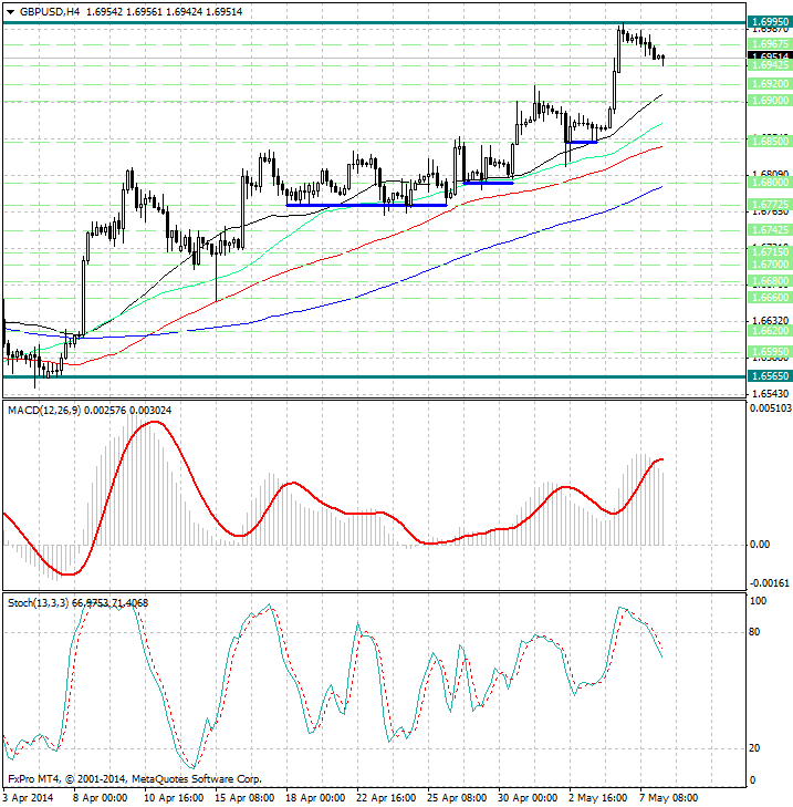 Курс валюты по-прежнему расположен значительно выше скользящих средних с периодами 34, 55, 89 и 144, которые направлены вверх и указывают на сохраняющиеся бычьи настроения (в среднесрочной перспективе), а также являются рядом уровней поддержки 1.69075, 1.68725, 1.6845 и 1.6795.