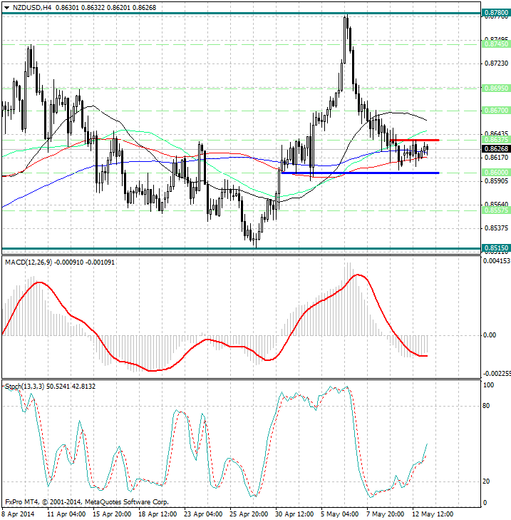 Курс валюты зажат между скользящих средних с периодами 55 и 34 (уровни сопротивления 0.86475 и 0.8660) с одной стороны и средних с периодами 144 и 89 (уровни поддержки 0.86225 и 0.86175) с другой.