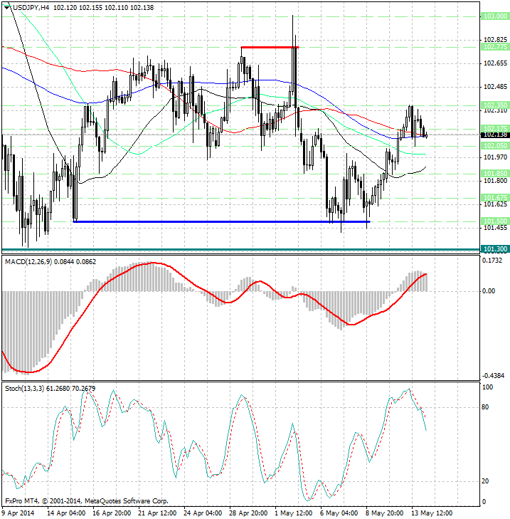 Курс валюты расположен выше скользящих средних с периодами 55 и 34, которые являются уровнями поддержки 102.00 и 101.90, и в данный момент практически слился со средними с периодами 89 и 144.
