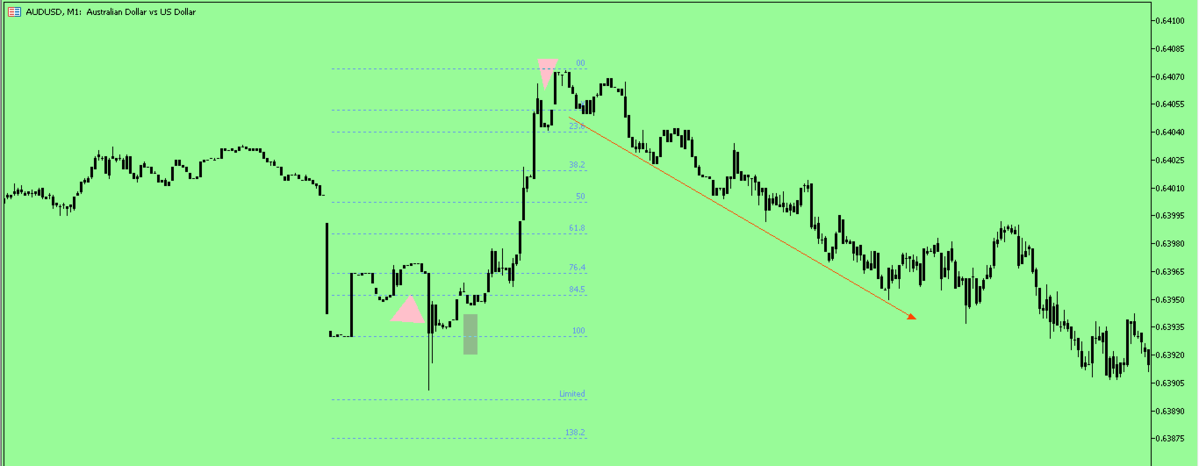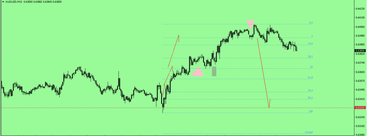На интрадей М15 австралиец достиг своего локального северного максимума, и теперь сформированы начальные условия для пробоя вниз и формирования флэта на М15. Найденная минутная структура, образно-подобная пятнадцатиминутному паттерну, указывает на цель внизу почти на уровне 100% по Фибоначчи. Из этого и буду исходить, принимая тейк-профит на отметке 0,63333.