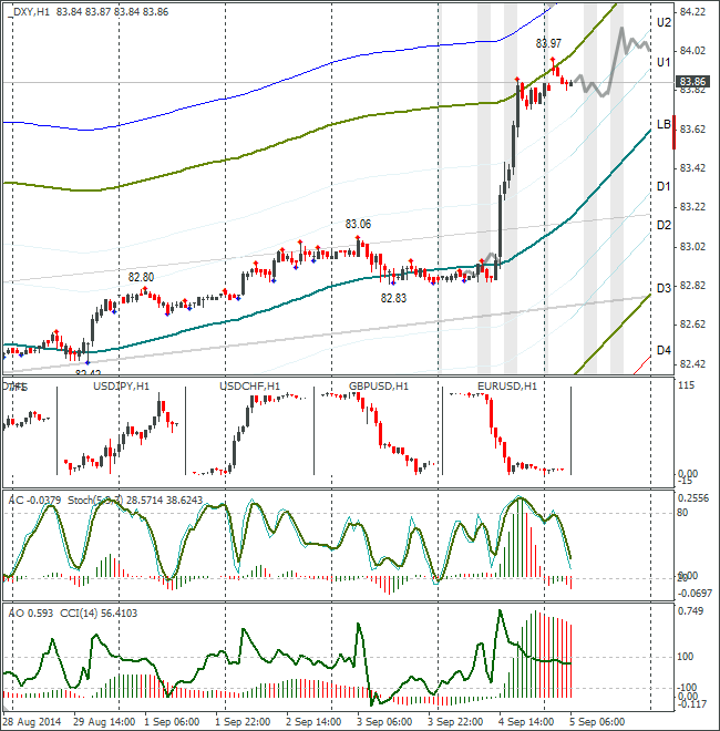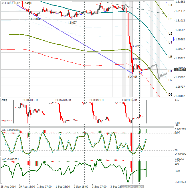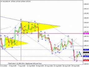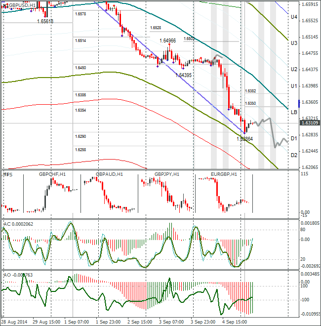На фоне роста доллара и приближающегося референдума в Шотландии курс GBP/USD упал до 1,6286. Фунт достиг ключевой поддержки по прогнозу на недельном тайм-фрейме (см. еж. обзор). В отскок фунта после вчерашнего падения евро верится с трудом. Думаю, если продавцы закрепятся ниже 1,6270, то откроется дорога на 1,5850. По основному сценарию я рассматриваю падение фунта до 1,6258. На часах по индикатору АО падение GBP не завершилось. Диверок надо нарисовать.