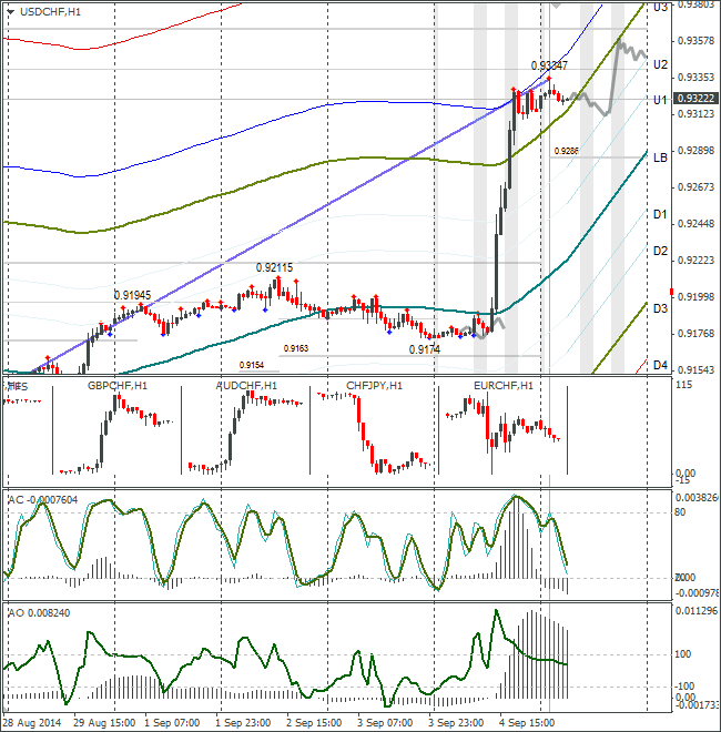 USDCHF зеркало пары EURUSD, поэтому на фоне падения единой валюты курс USDCHF вырос до 0,9334. Сейчас цена находится у линии U3. Так как сегодня пейролс, то до 16:30 мск ожидаю коррекцию и после выхода отчёта рост до 0,9355. Пока вижу такой техническую картину по этой паре.