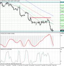 Гистограмма MACD по-прежнему расположена в отрицательной зоне и ниже своей сигнальной линии, но начала очень плавно повышаться и тем самым указывает на возможное затухание медвежьих настроений.