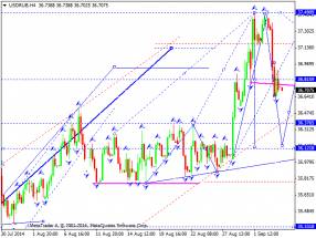 Российский рубль продолжает развитие структуры снижения. На сегодня пробит канал роста с развитием фигуры продолжения снижения. Ожидаем отработку волны с целью на уровне 36.12. Далее рассматриваем отработку коррекции к уровню 36.80. Затем рассмотрим продолжение снижения на перекрытие уровня 34.70.