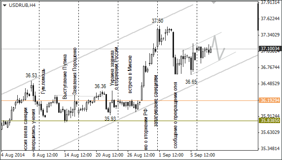 Второй день американский доллар консолидируется на уровне 37,07. За это время на уровне 37,16 образовалось сопротивление. Ни перемирие, ни предварительный доклад о причинах катастрофы Boeing-777 над территорией Украины не смогли выбить курс из ценового диапазона 36,65-37,16. Всё идёт к тому, что сегодня доллар может проверить на прочность сопротивление 37,16 и уйти вверх. Сильного роста от доллара не ожидается, однако есть вероятность возвращения курса к отметке 37,35/40.