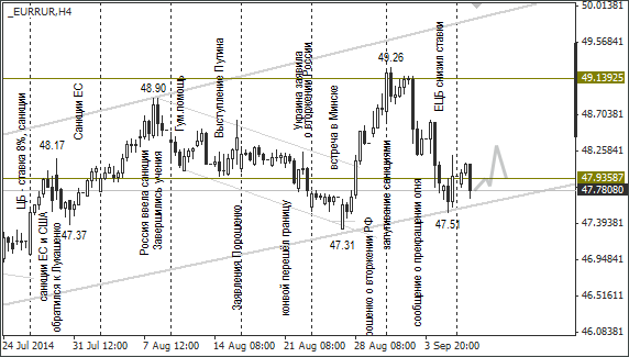 Курс евро консолидируется у нижней границы восходящего канала на уровне 47,87. За последние два торговых дня пара евро/рубль не смогла пробить трендовую линию. Учитывая, что единая валюта на рынке Форекс с открытия американской сессии перешла в коррекционную фазу, на сегодня есть риск повышения курса до 48,35/40.