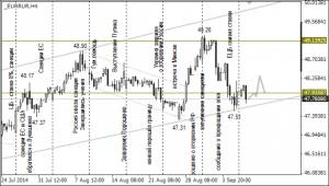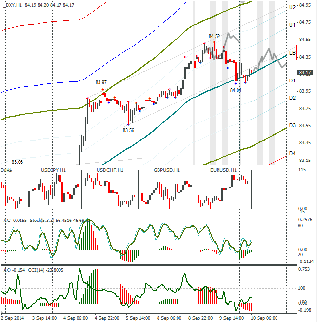 Фунт начинал отходить от шотландского синдрома. По итогам торгов во вторник индекс доллара скорректировался до линии lb. Ночные падения меня начинают удивлять. Индекс DXY снизился до 84,04. При этом стоит заметить, что индекс пробил восходящий ценовой канал, который я начертил по трем точкам. Сначала по максимумам проводится линия. Затем параллельная линия прикладывается к минимуму 83,56. Для меня пробой канала сигнализирует о начале коррекции, или флэт затянется дня на три.
