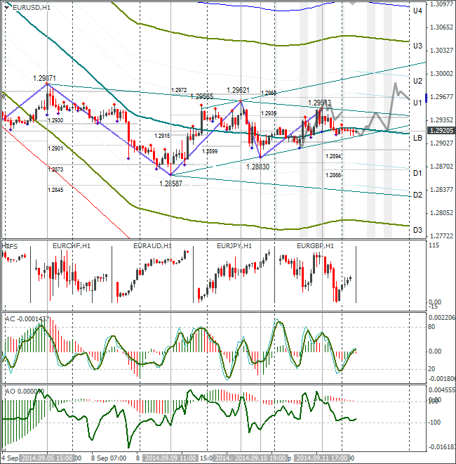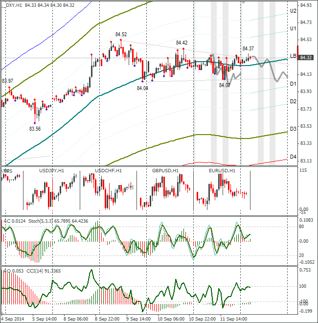 Ожидания по вчерашнему дню отчасти оправдались. Индекс доллара снизился до 84,07 и отскочил к 84,37. По факту имеем поддержку на уровне 84,05. Ситуация остаётся неопределённой. Собственно даже писать нечего. Компании YouGov и Survation представили противоречивые данные. По опросу YouGov – 54% опрошенных высказались за независимость Шотландии, по данным Survation – 53% опрошенных высказались против отсоединения страны от Великобритании. Фунт укрепился, при этом ценовая модель с тремя вершинами на часах, меня настораживает. На ней он может сорваться вниз. По евро/доллару формируется треугольник и в текущей ситуации может последовать выстрел как вверх, так и вниз. На пятницу по доллару рассмотрел падение.