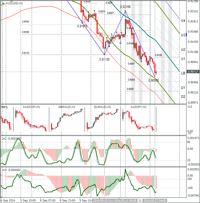 Динамикой британского фунта в последнее время правят ожидания итогов референдума по независимости Шотландии. Предварительная информация по настроениям шотландцев оказывается весьма противоречивой. То большинство высказывается в пользу отделения, то, наоборот, перевес оказывается на стороне тех, кто ратует за единство. На этом фоне любые отчеты по экономике Великобритании и комментарии официальных лиц (которых, надо сказать, на текущей неделе, немного) оказываются без внимания. Таким образом, есть основания предполагать, что по мере приближения дня референдума (18 сентября) фунт будет продолжать ослабевать по отношению к большинству противников.