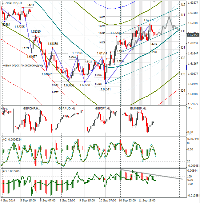 Компании YouGov и Survation оказывают сильное влияние на британский фунт. Вчера компания Survation обнародовала свой опрос. По их данным желающих отсоединиться от Великобритании составляет меньше 50%. Фунт по итогам дня вырос до 1,6276. В Азии пара GBP/USD торгуется по 1,6236. Я хоть рассматриваю на сегодня обновление максимума, меня беспокоит модель с тремя вершинами и двойной медвежьей дивергенцией. В такой ситуации лучше быть вне рынка. Если нижняя граница канала будет пробита, есть риски вернуться к 1,6180. Если фунт доберётся до 1,6305, то можно от него его продать.