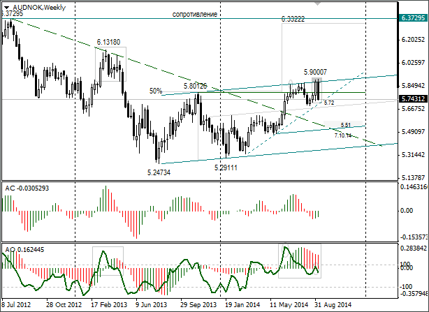 С 16 по 20 июня текущего года недельные торги в паре AUD/NOK завершилась пробоем трендовой линии на уровне 5,6375. После пробоя рост австралийского доллара против норвежской кроны продолжался до отметки 5,90, где «быки» упёрлись в сильное сопротивление, которое образовалось от ноябрьской вершины 2013 года. Проекция от вершины 5,8013 есть параллель к линии, проведённой по основаниям 5,2473 и 5,2911 (см. график).