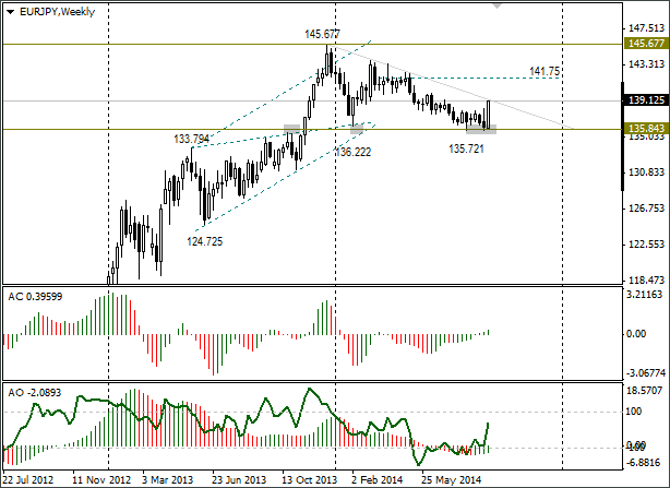 Торговые возможности по валютной паре: EUR/JPY отбилась от поддержки и последней недельной свечой перекрыла девять предыдущих недель. Есть высокие риски, что на фоне слабости йены и восстановления евро с долларом США трендовая линия будет пробита. В этом случае можно присмотреться к двум уровням: 141,75 и 145,67. Если давление на евро вновь усилится, рост к 145,67 будет продолжительным. Срок жизни идеи до первой цели 141,75 – до 1 декабря 2014 года, до второй цели 145,67 – до 31 января 2015 года. Обе идеи утратят свою актуальность при падении курса ниже 135,45.