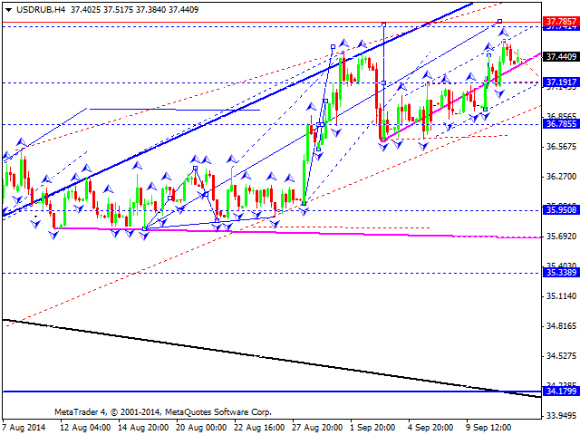 Российский рубль продолжает торговаться под давлением фундаментального фона в рост, развивая консолидацию на вершине волны. На сегодня рассматриваем возможность перекрытия уровня 37.77. Далее - снижение к уровню 37.20. Затем будем рассматривать возможность развития консолидации перед снижением в коррекцию к уровню 35.05.