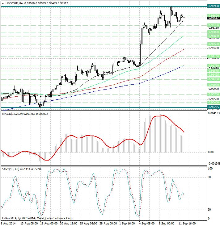Курс валюты по-прежнему расположен существенно выше скользящих средних с периодами 34, 55, 89 и 144, которые направлены вверх и указывают на сохраняющиеся бычьи настроения (в среднесрочной перспективе), а также являются рядом уровней поддержки 0.9340, 0.9285, 0.92375 и 0.91775.