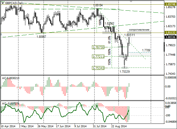 Британский фунт рухнул на ожиданиях итогов референдума по независимости Шотландии. В субботу 6 сентября компания YouGov опубликовала результаты опроса, согласно которым за независимость Шотландии готовы проголосовать 51% шотландцев. Премьер-министр Великобритании пытался уговорить местных жителей не голосовать за отделение от Соединённого Королевства. Видимо, ему это удалось, поскольку последний опрос компании YouGov показал, что к концу недели настроения шотландцев поменялись и теперь в большинстве оказались сторонники сохранения единства Великобритании – 52 против 48. Результаты опроса отразились на всех парах с британским фунтом. За минувшую неделю GBP/CAD восстановился с минимума 1,7532 до 1,8051.
