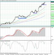 Обратив внимание на 4х часовой график можно заметить, что:ярко выраженный восходящий тренд сохраняется,курс валюты постепенно "взбирается к новым вершинам"...