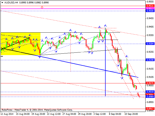 Здесь продолжения формирования восходящей структуры от 9 сентября ожидаем после пробоя 1.2996, в данном случае цель – 1.3030. Потенциальным значением для верха считаем уровень 1.3047, до которого ожидаем оформления выраженной структуры для восходящего цикла. Краткосрочное нисходящее движение возможно в коридоре 1.2932 – 1.2905, пробой последнего значения будет располагать к развитию нисходящей структуры, в данном случае первая цель – 1.2861, в коридоре 1.2861 – 1.2833 консолидация цены. Потенциальным значением для низа считаем уровень 1.2774.