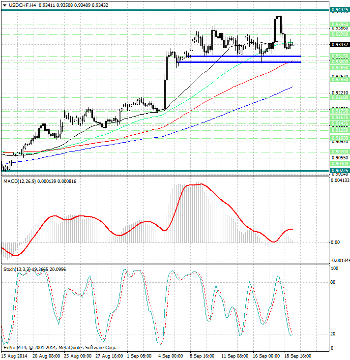 Курс валюты зажат между скользящих средних с периодами 55 и 34 (уровень сопротивления 0.9350) с одной стороны и средних с периодами 89 и 144 (уровни поддержки 0.93025 и 0.92375) с другой.