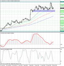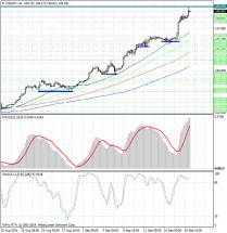 RSI повышается над уровнем 50 в пределах зоны перекупленности.