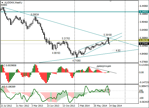 Торговые возможности по валютной паре: AUD/DKK отбился от одной трендовой линии и пробил другую. Рост от 4,7106 следует расценивать как коррекцию в нисходящем тренде, который зародился в июле 2012 года. Пока австралиец слаб, можно предположить, что падение AUD/DKK продолжится до уровней 5,00 и 4,93. Идея будет актуальна в течение 13-14 недель, до середины декабря 2014 года. Отменится при пробое трендовой линии или уровня 5,3350.